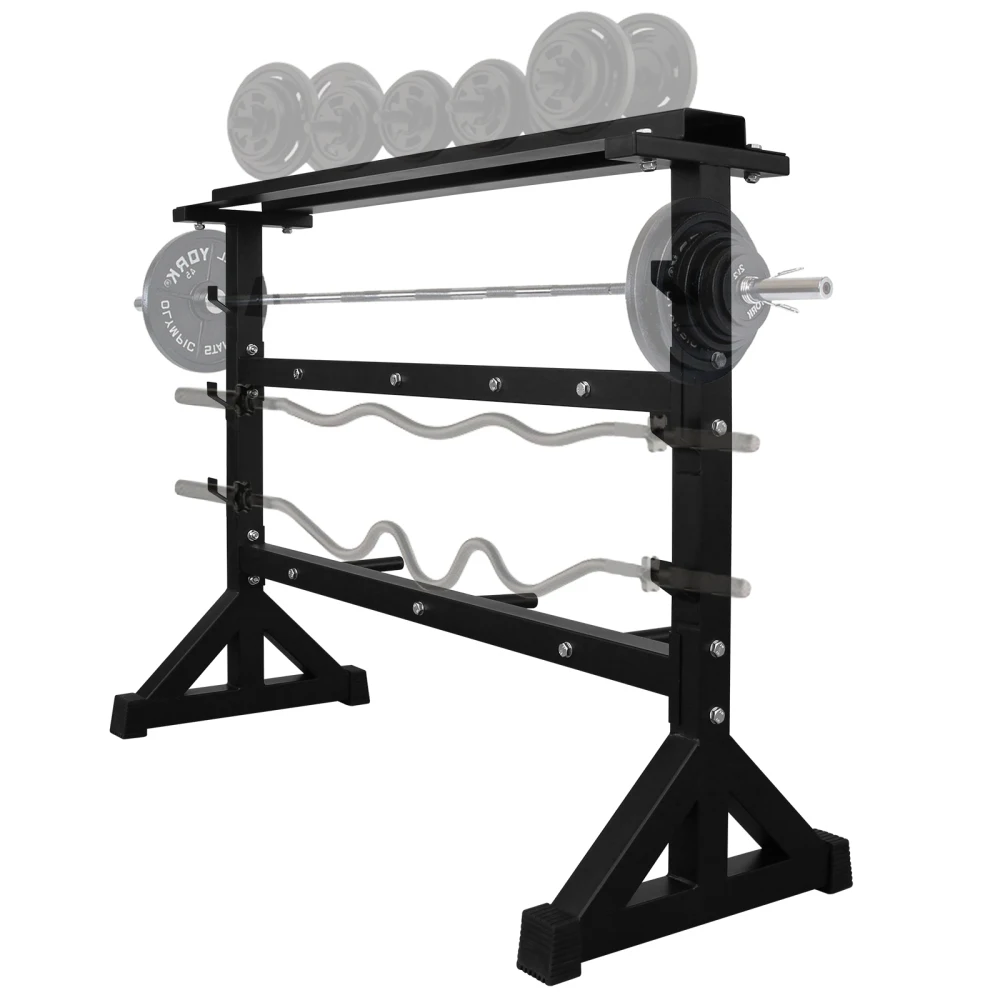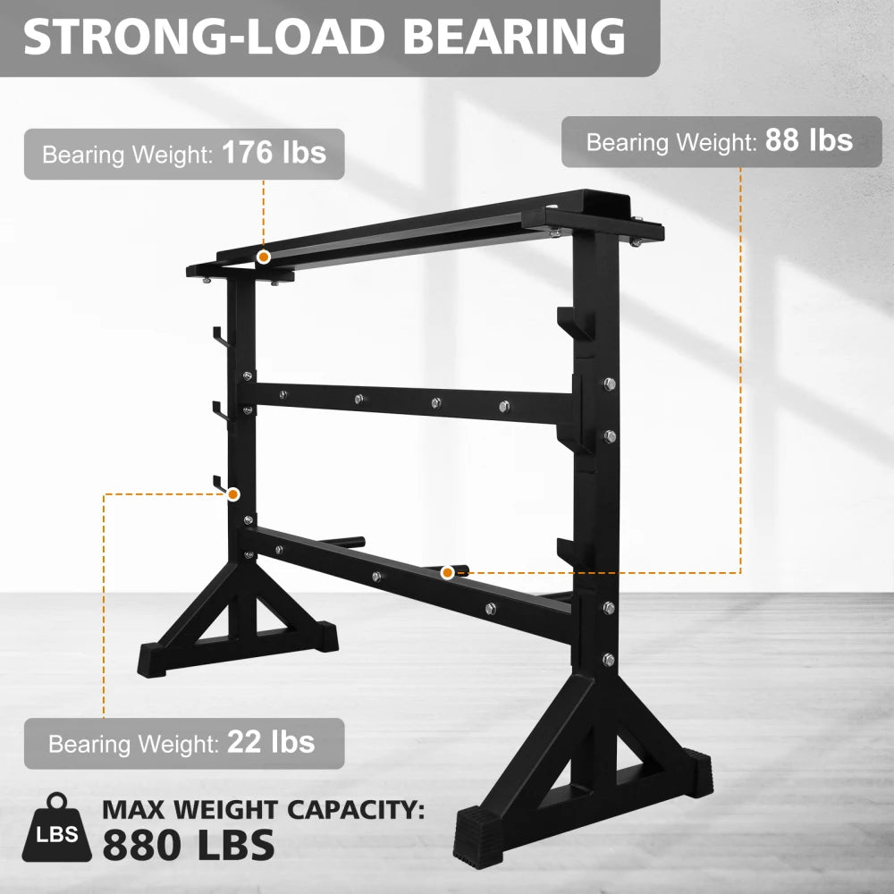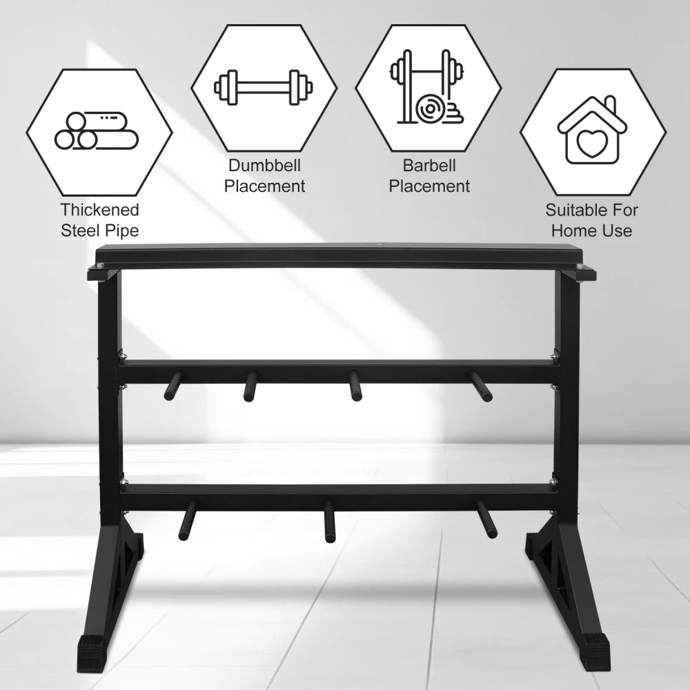 【HEAVY DUTY CONSTRUCTION】 Made of heavy-duty steel tubing and sturdy construction for durability, this rack is compact and stable, featuring a rectangular frame for holding a variety of fitness tools. - 【UNIQUE DESIGN】 Store your fitness accessories on this versatile rack with its unique three-tier shelves and multiple storage pillars to keep dumbbell sets, deadlift sets and other weightlifting tools in one place
