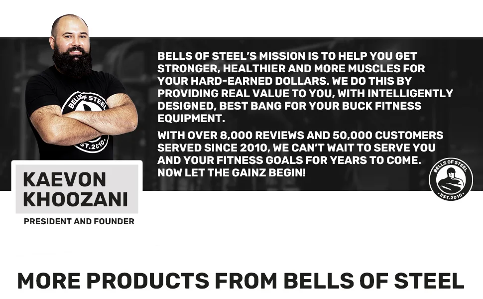 Bells of Steel's mission is to help you get stronger, healthier and more muscles for your hard-earned dollars. We do this by providing real value to you with intelligently designed, best bang for your buck fitness equipment. With over 8,000 reviews and 50,000 customer served since 2010, we can't wait to serve you and your fitness goals for years to come!