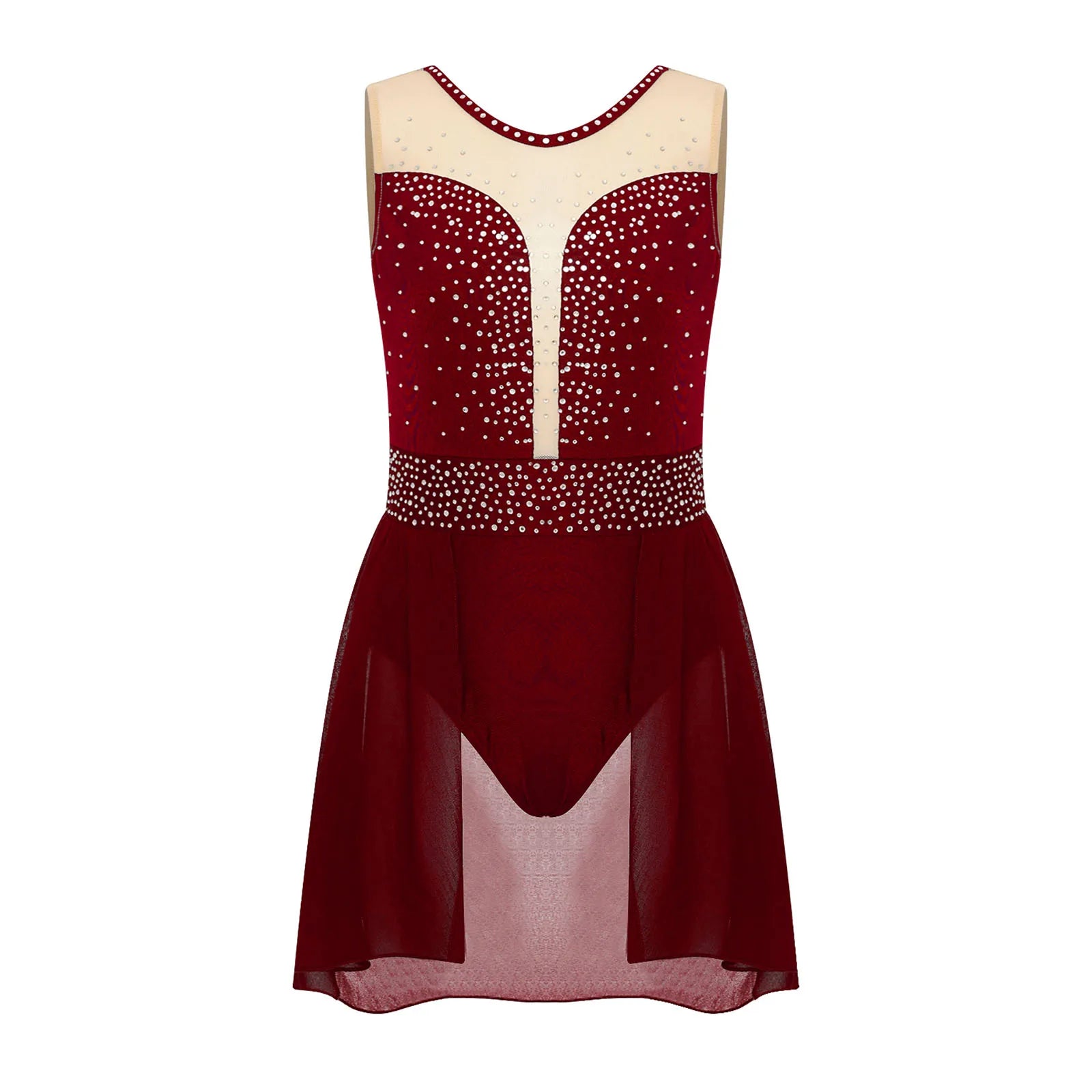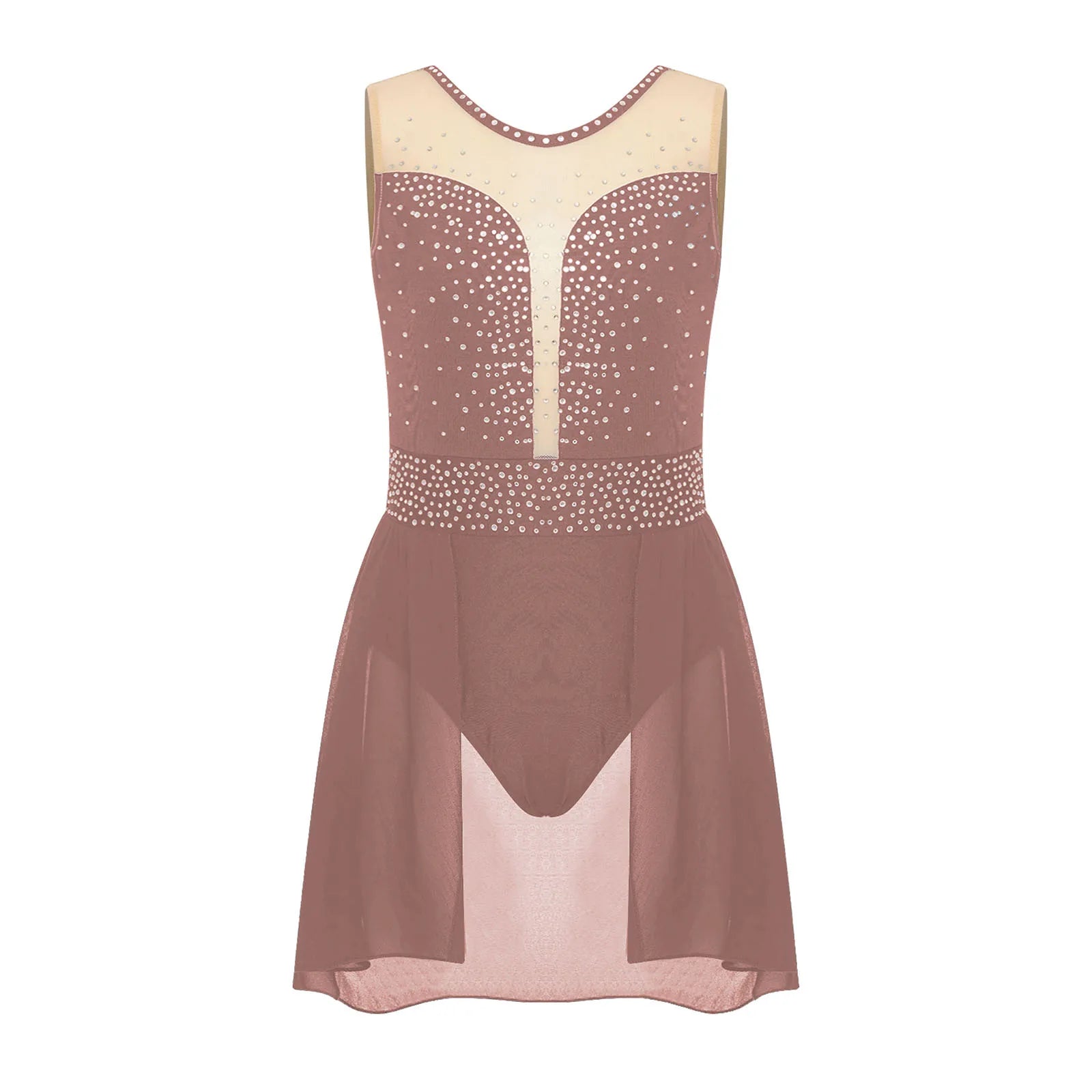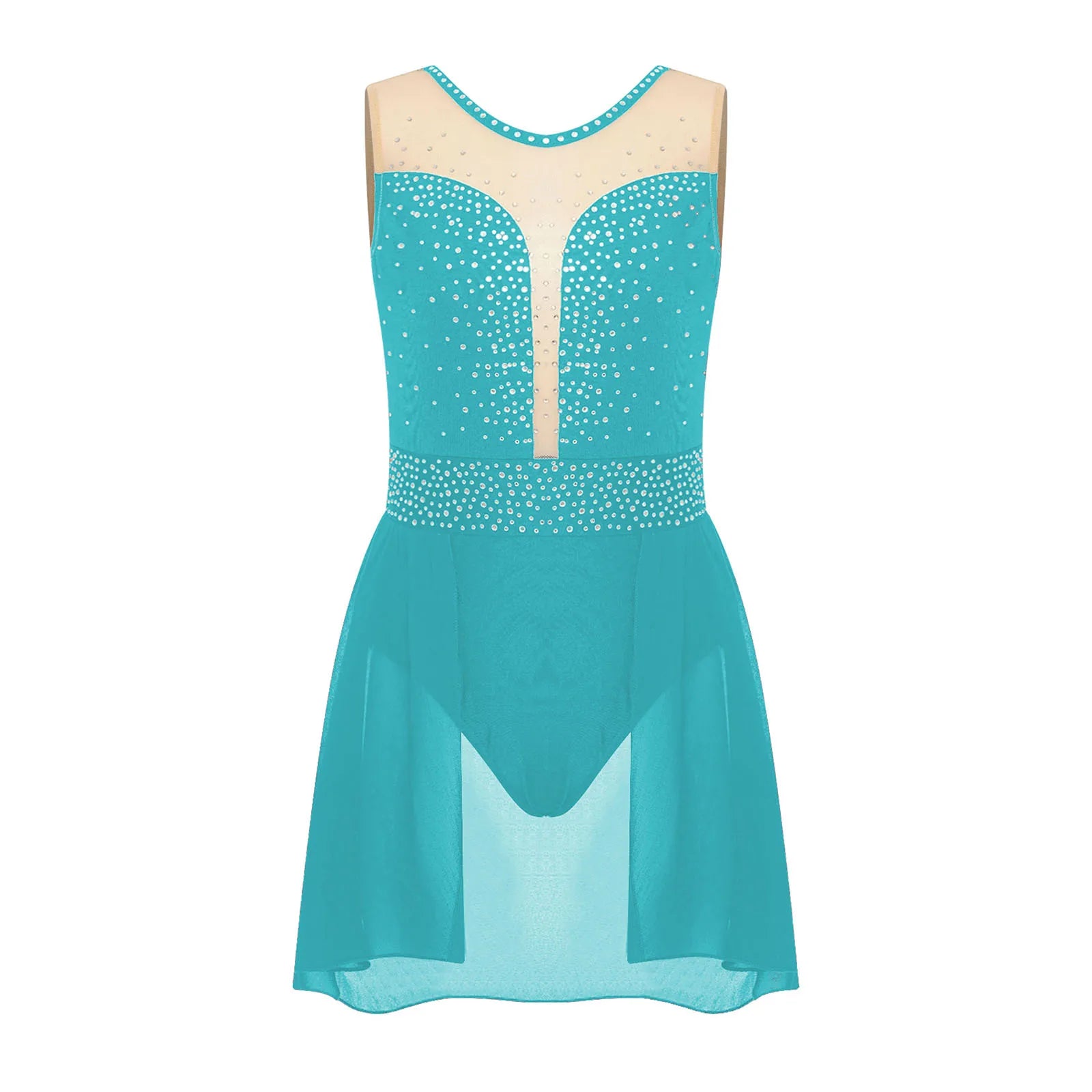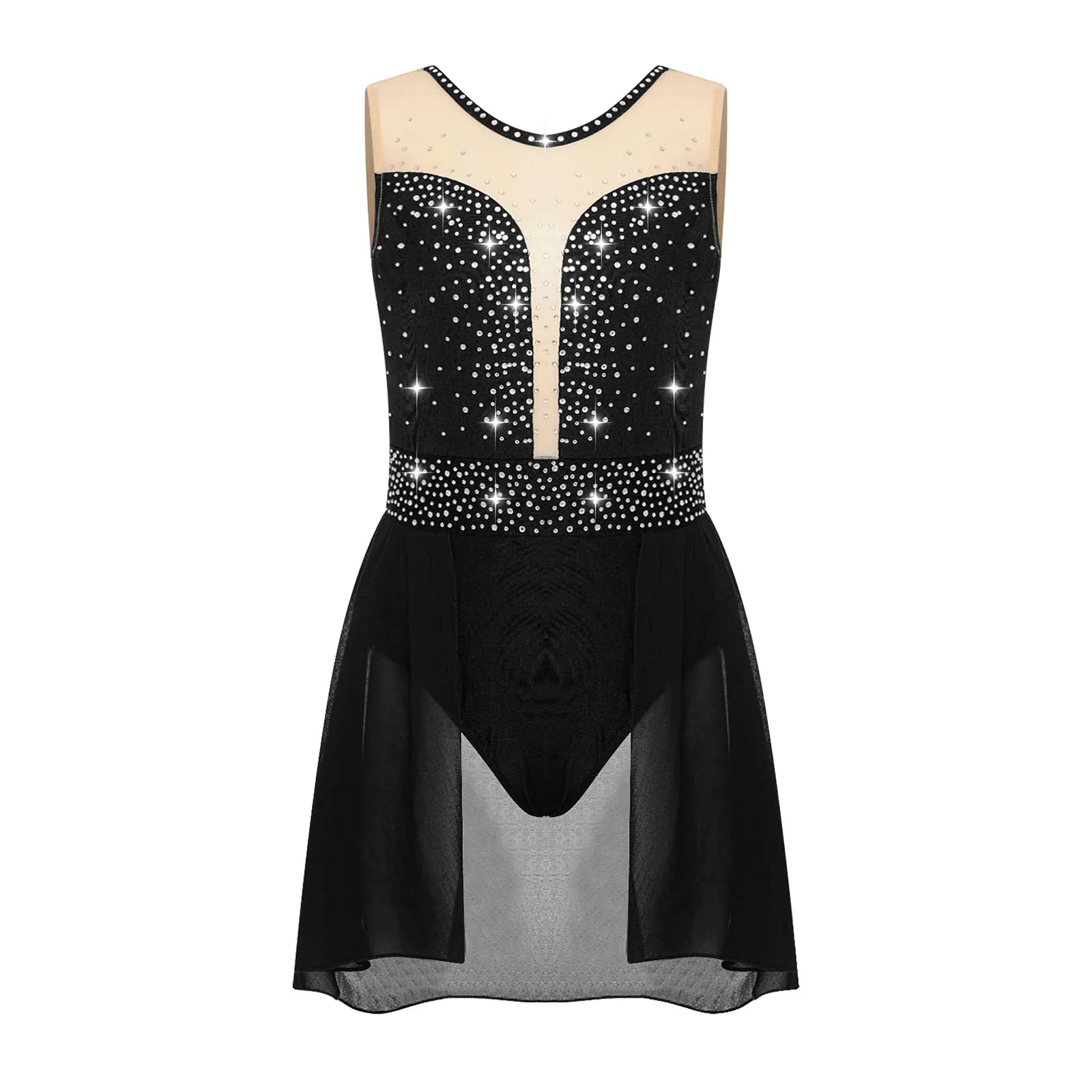 The bodice of the dance leotard is adorned with shiny rhinestones to create an eye-catching effect and brighten up any performance.