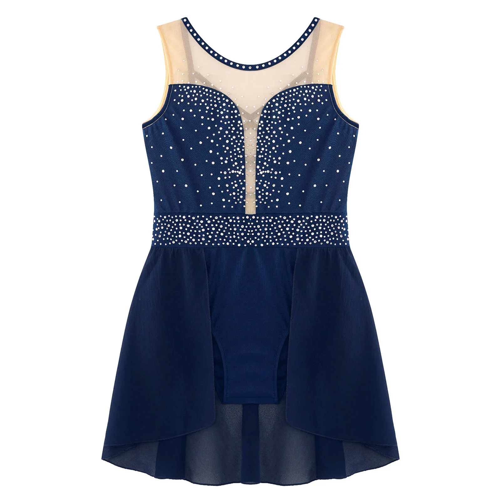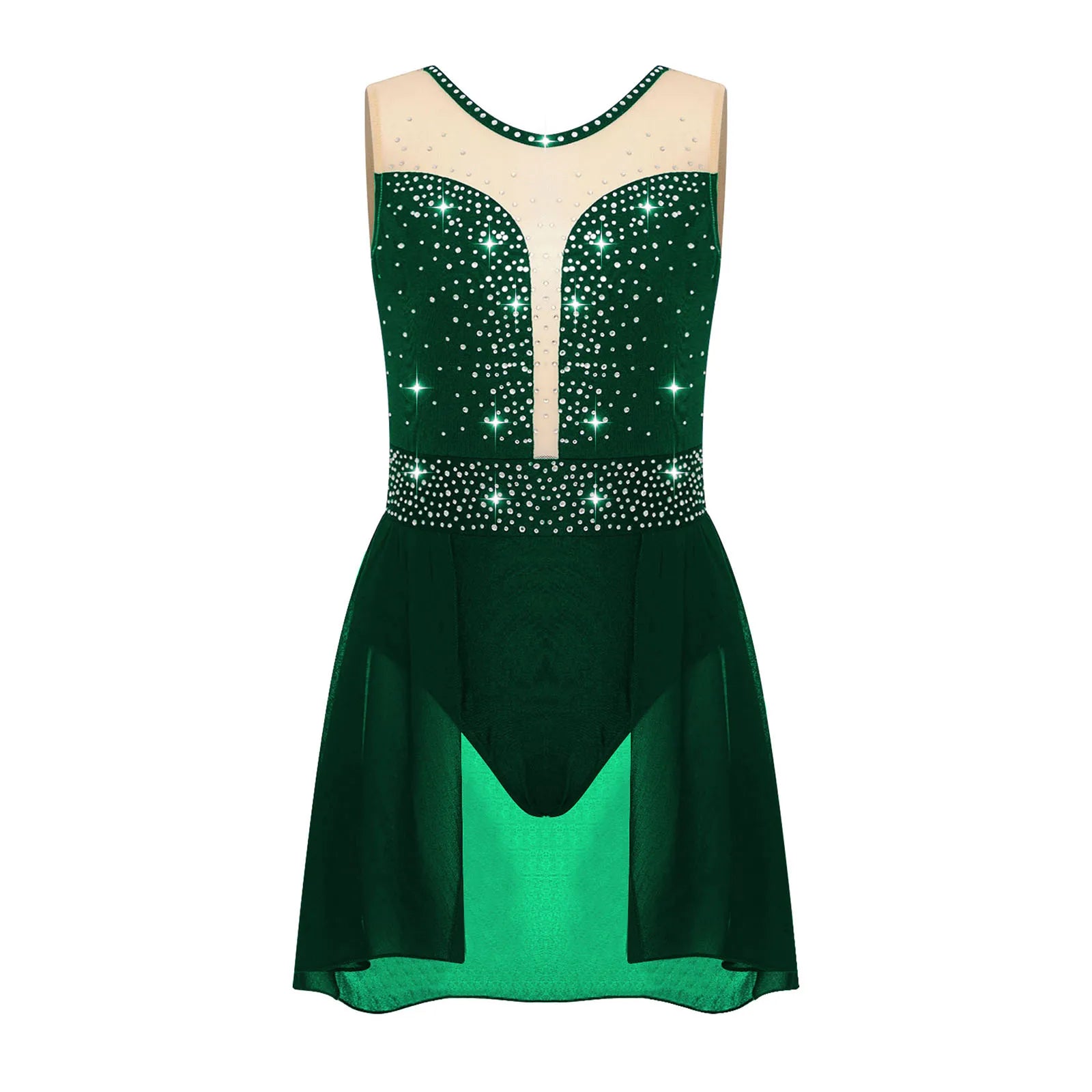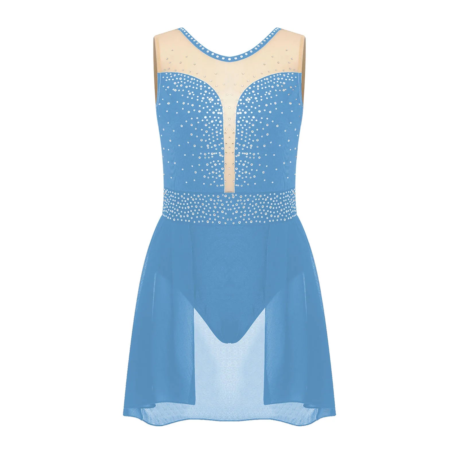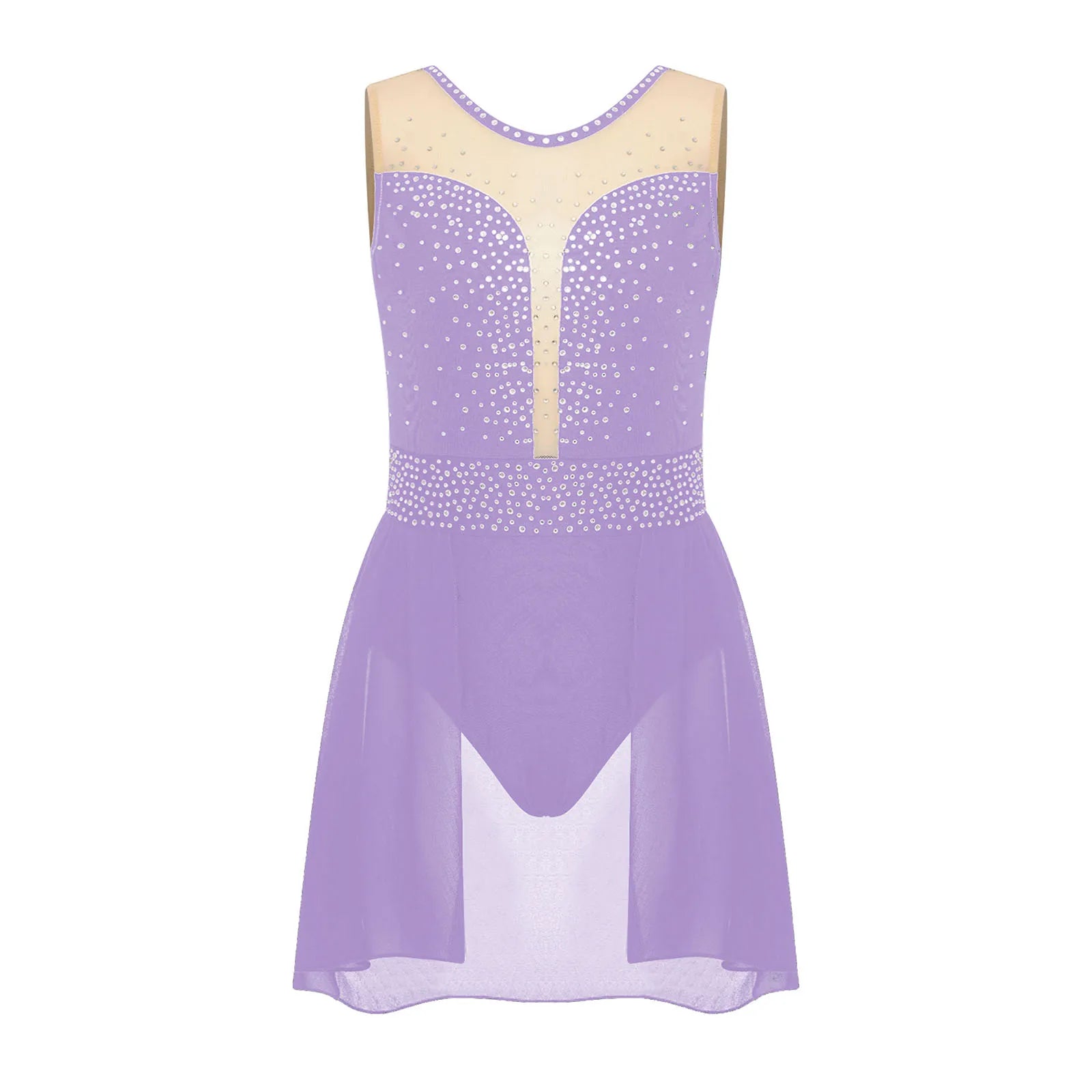 The bodice of the dance leotard is adorned with shiny rhinestones to create an eye-catching effect and brighten up any performance.