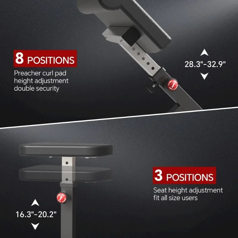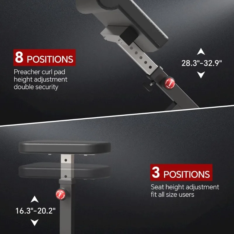 • 【FULL ADJUSTABLE SETTINGS】: Our preacher curl bench has three parts adjustable by turning and pulling the knobs to make sure it will fit different body shapes. The barbell & dumbbell holders have 5 positions adjustable (22.6"-26.5"), the armrest pad has 8 positions adjustable (28.3"-32.9"), and the seat cushion has 3 positions adjustable (16.3"-20.2"). The full adjustments options will make this bench fit all family members.