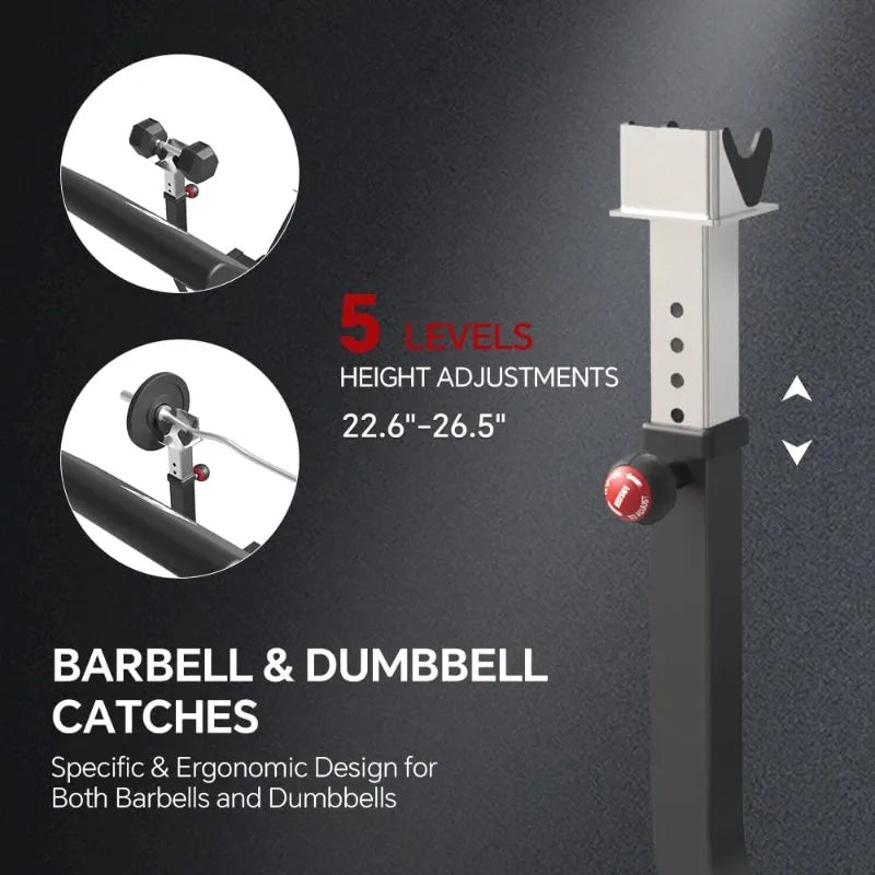 • 【SPECIFIC DESIGN】: The barbell catches on this bench use a specific design of double braced support on each side, which means you can put both barbells and dumbbells on the catches. The grooves on the catches make it more ergonomic and convenient to pick up dumbbells.The anti-skid cover can protect the barbells and dumbbells from wear when putting them on the catches and the rubber foot cover will also protect your floor when moving it.