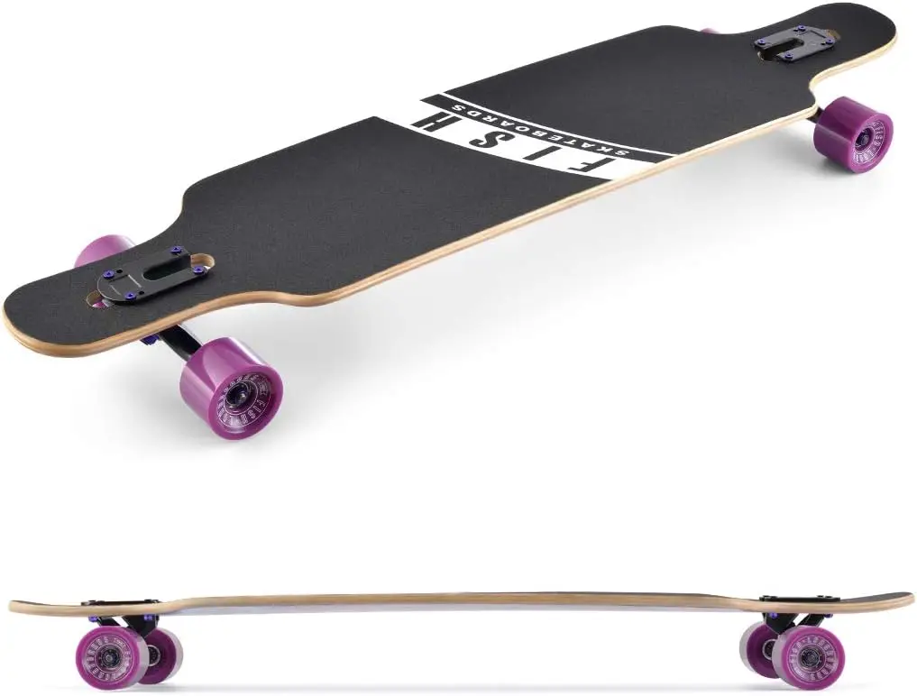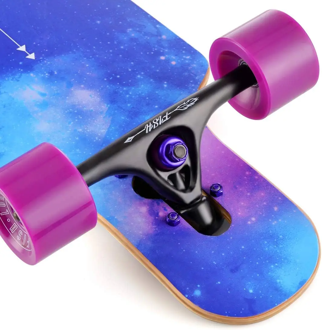 Discover the ultimate skateboarding experience with our high-performance longboard, designed to cater to skaters of all skill levels. This complete cruiser is ready to ride right out of the box, making it an excellent choice for beginners and professionals alike. Key Features: - **Versatile Design**: With a full-size 41 x 9-inch deck, this skateboard is perfect for learning basic stunts or mastering advanced tricks. Its balanced construction ensures stability and control during every ride. - **Durable Construction**: Crafted from premium-grade Canadian maple wood in an 8-ply configuration, the deck offers exceptional strength and longevity. The non-slip emery surface provides a secure grip, enhancing safety and performance while supporting up to 330 lbs. - **Smooth Performance**: Equipped with super smooth 70x51mm HR82A anti-shock PU wheels and precision Abec-9 Chrome steel bearings, this board delivers a fast and comfortable ride. The SHR95A soft bushings absorb vibrations for added comfort on various terrains. - **Sturdy Components**: Featuring heavy-duty aluminum alloy trucks measuring 7 inches with reinforced steel axles, the skateboard ensures reliable handling and durability. This robust setup makes it safe for both novice riders and seasoned skaters. - **Complete Package**: No assembly required—this skateboard comes fully assembled with an all-in-one T-tool for easy maintenance and adjustments. It's an ideal gift option for boys and girls who love outdoor activities or want to start skating. Benefits: - Enjoy a stable and powerful grip thanks to the high-density maple deck and non-slip surface. - Experience speedy rides with smooth wheels that reduce shock and enhance maneuverability. - Rely on sturdy trucks that provide consistent support without compromising on safety. - Save time with a ready-to-use setup that includes essential tools for upkeep. This longboard combines quality materials with thoughtful design elements to offer a reliable skating solution suitable for cruising downhill paths or practicing freestyle moves in urban settings.