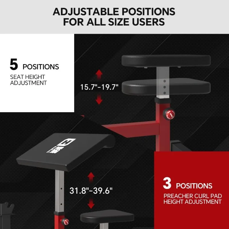 - 【FULL HEIGHT ADJUSTMENTS】: This adjustable preacher curl bench has full height adjustments on three parts: Arm Rest Pad--3 heights adjustable (32"-40"), Seat Pad--5 heights adjustable (16”-20”) and Barbell Holder--3 heights adjustable(23”–26”). The various height choices make the bench suitable for most users with different heights and body shapes.