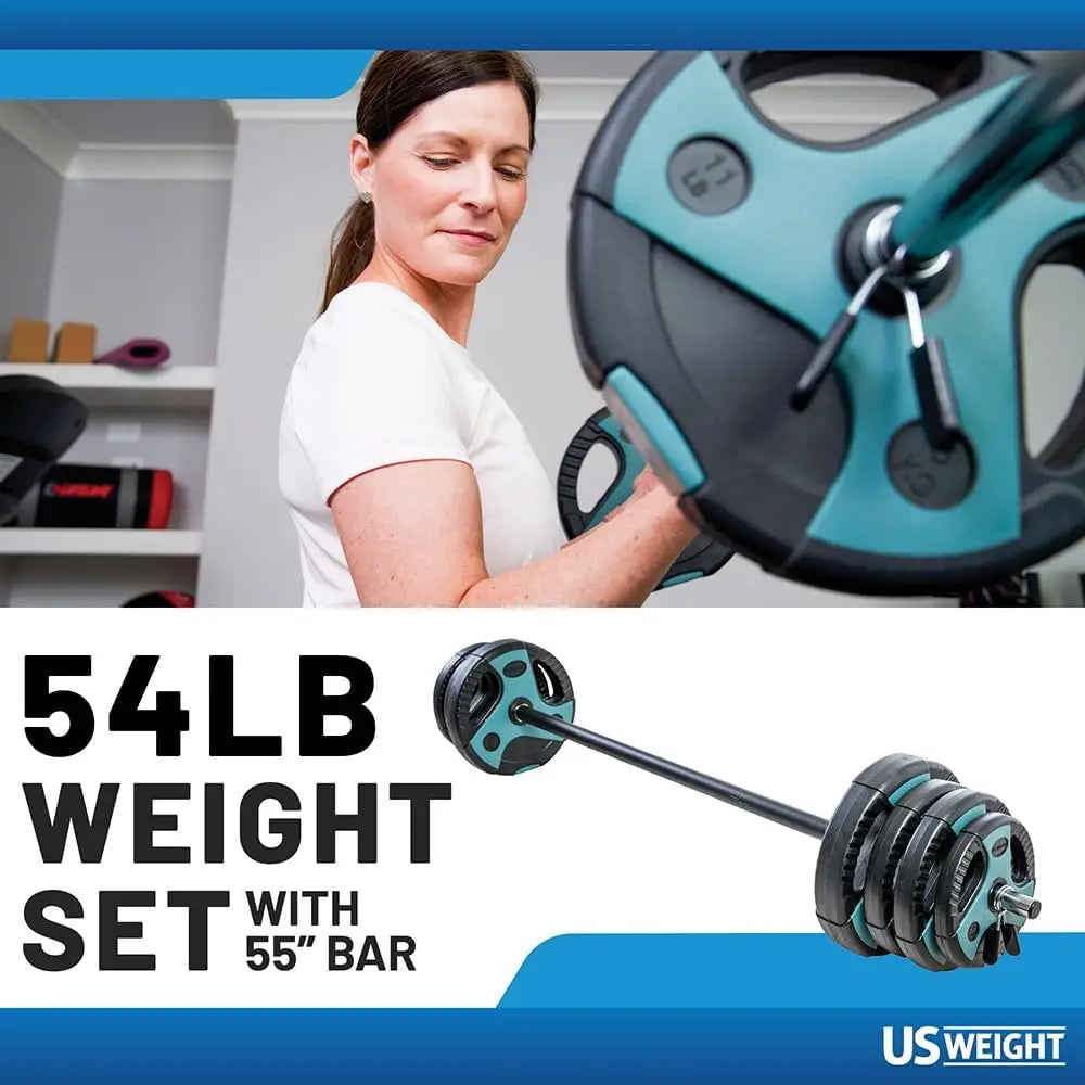 54 lb Barbell Weight Set includes: - 3 piece bar, Two (2) spring collars, Two (2) 11lb Weights, Four (4) 5.5lb Weights and Two (2) 2.75lb Weights. Adjust your weights for more options.