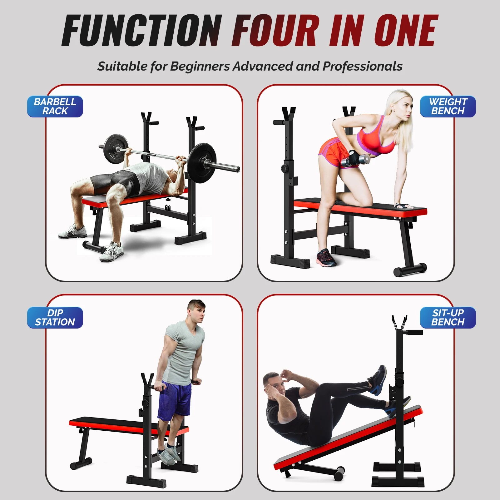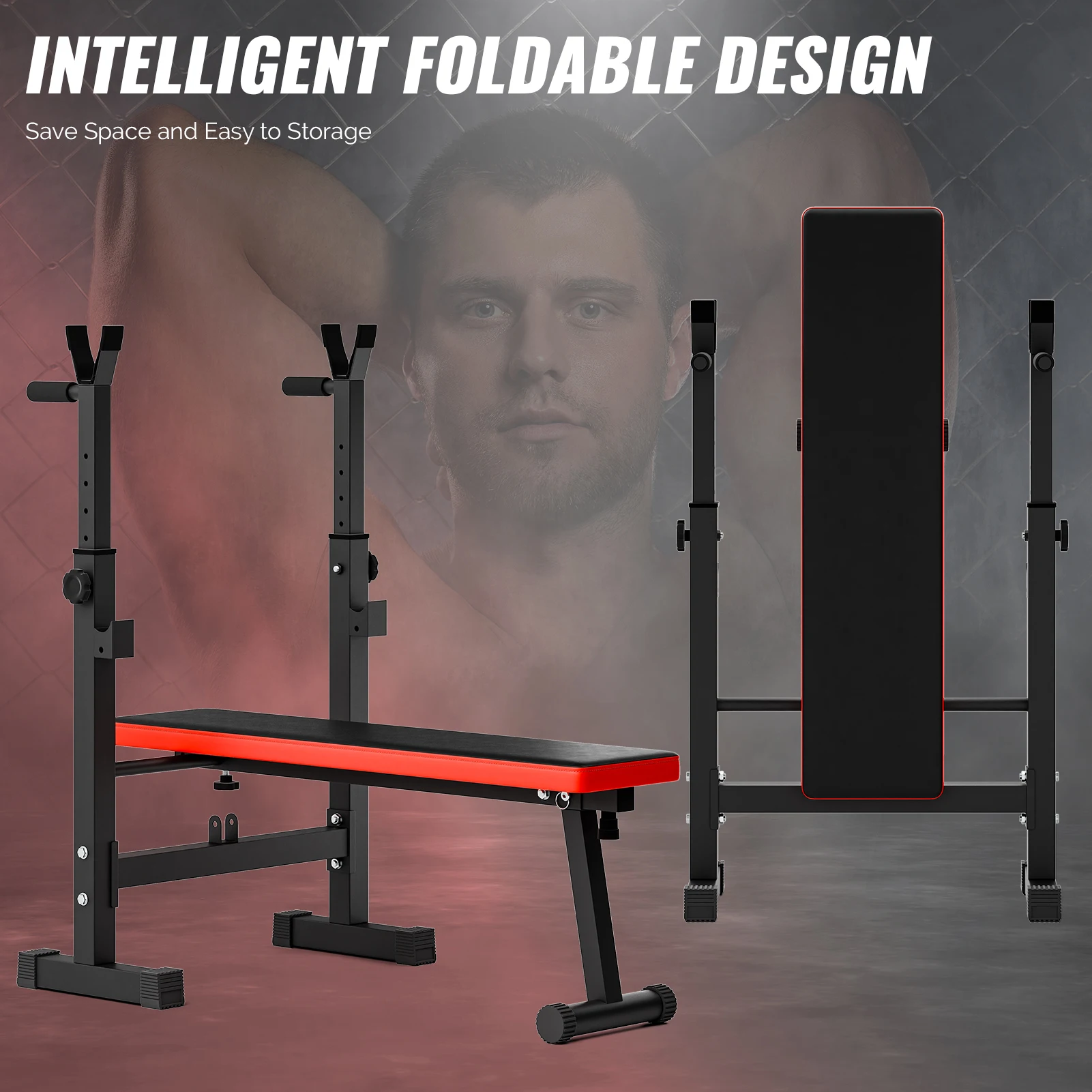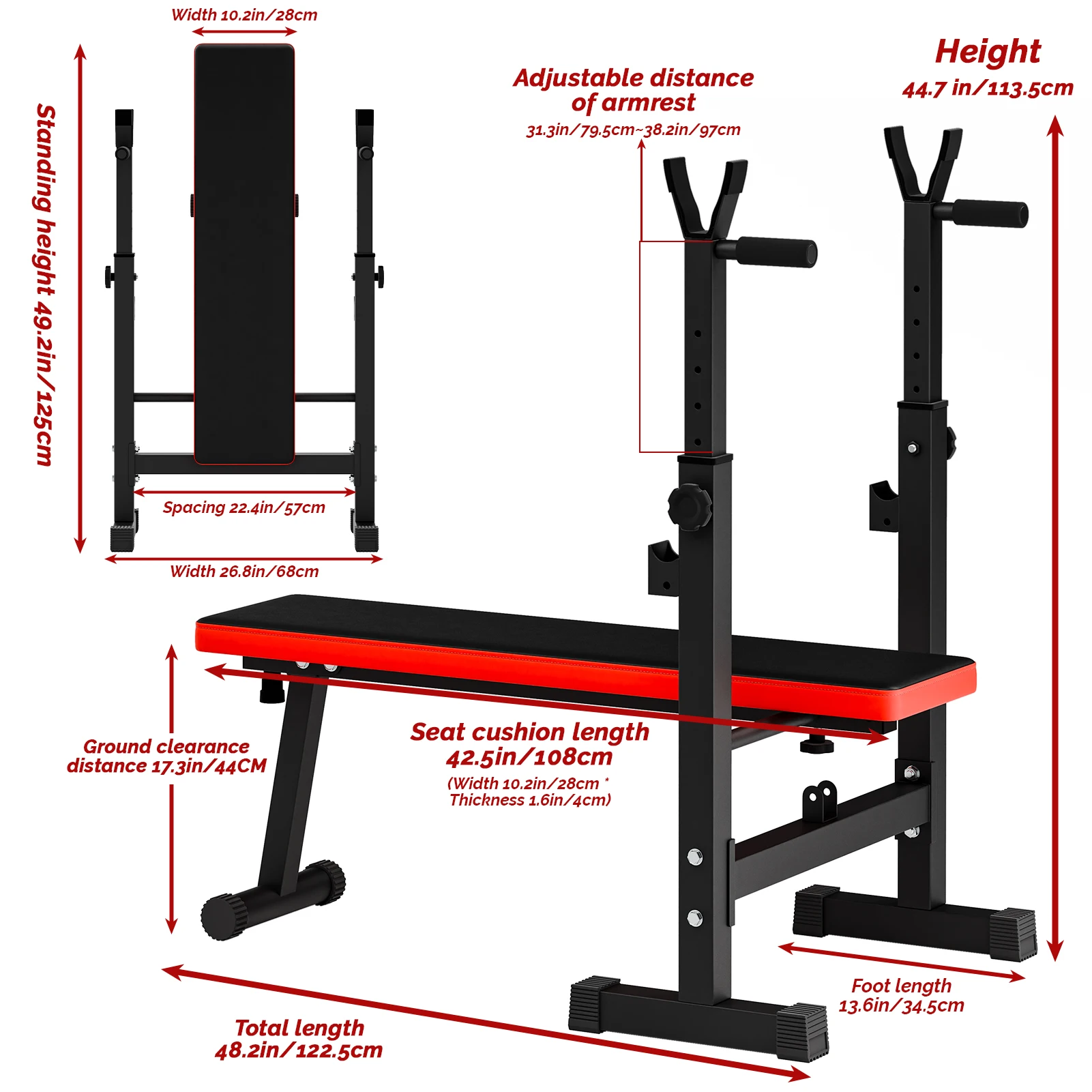 Adjustable And Foldable: The height of the barbell rack can be adjusted in 6 levels for different arm lengths, and the collapsible weight bench with rack saves tons of space in your home, whether it's in a cramped bedroom or in the garage.
