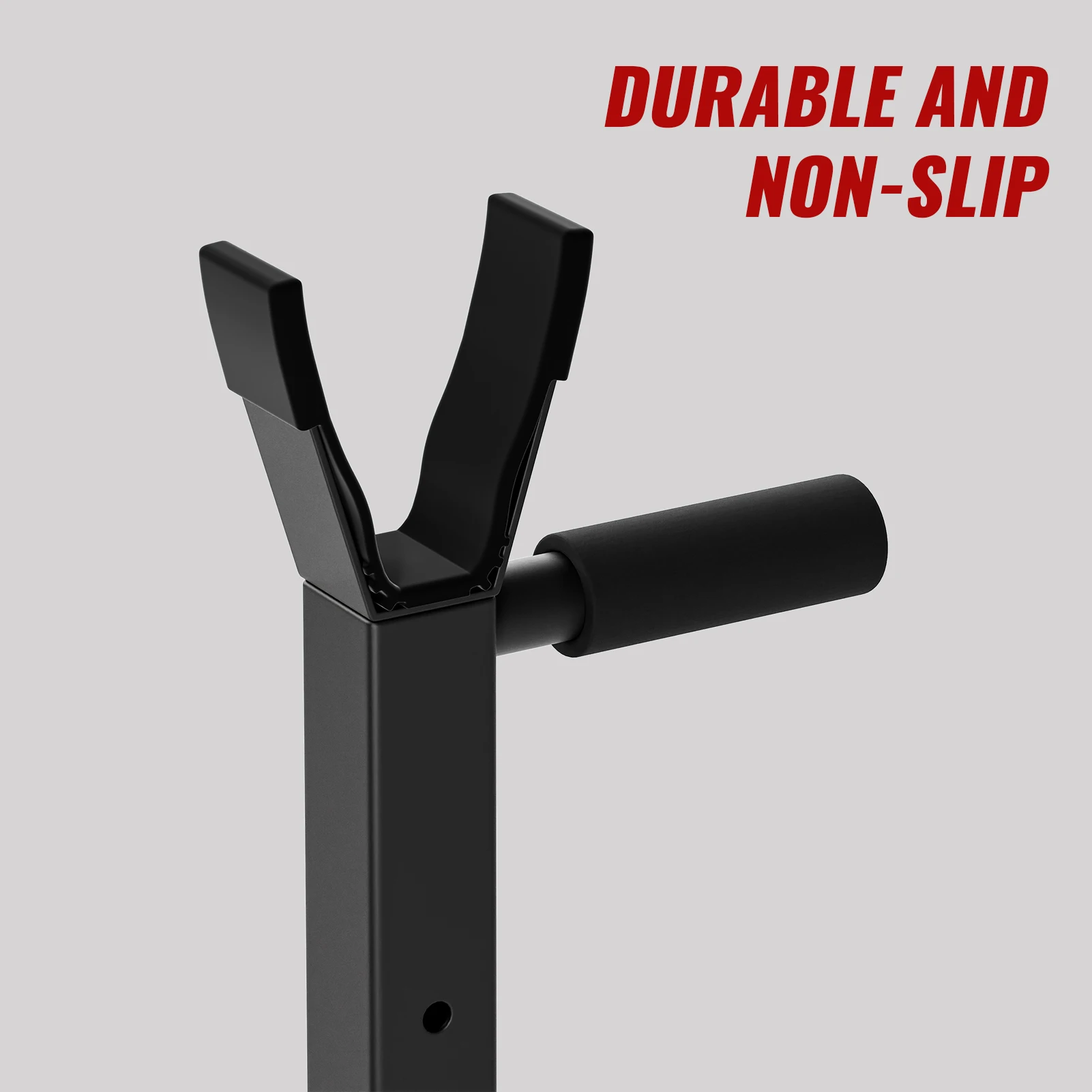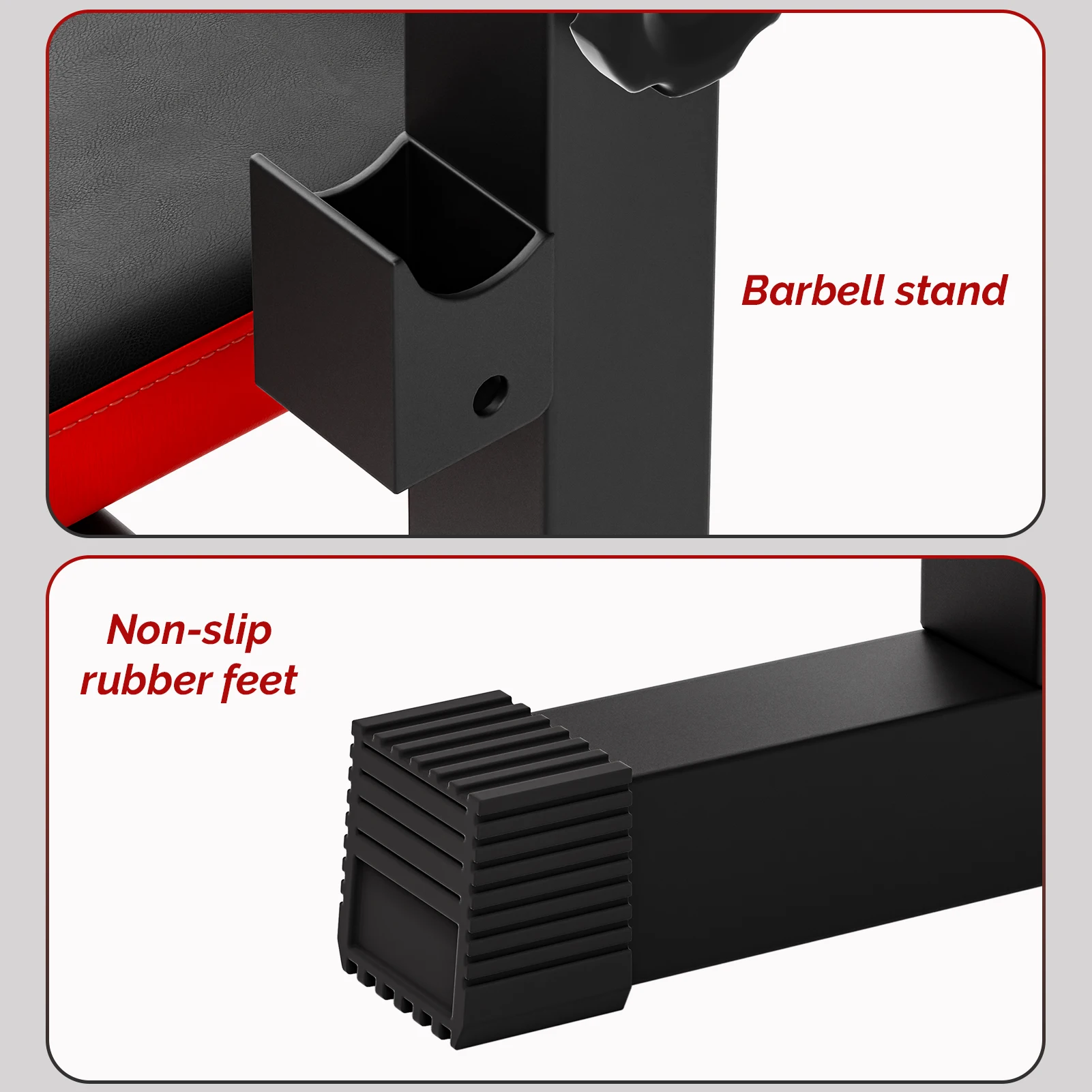 Ergonomic Design: The width of the main rack has been specifically increased to make doing bench presses more comfortable and to accommodate different shoulder widths, as well as to prevent barbells from tipping over more effectively. A barbell storage bar has been added to the base to help store barbell pieces.