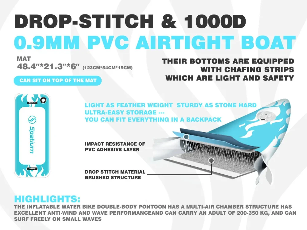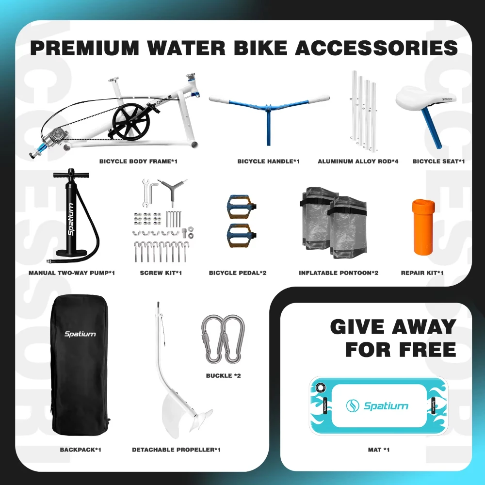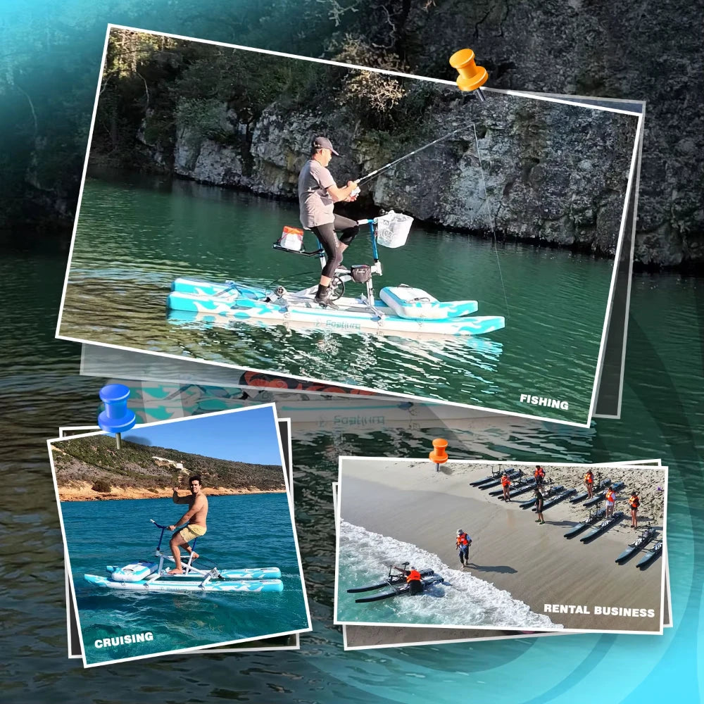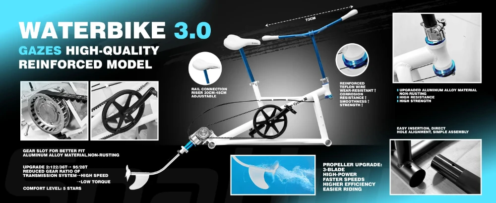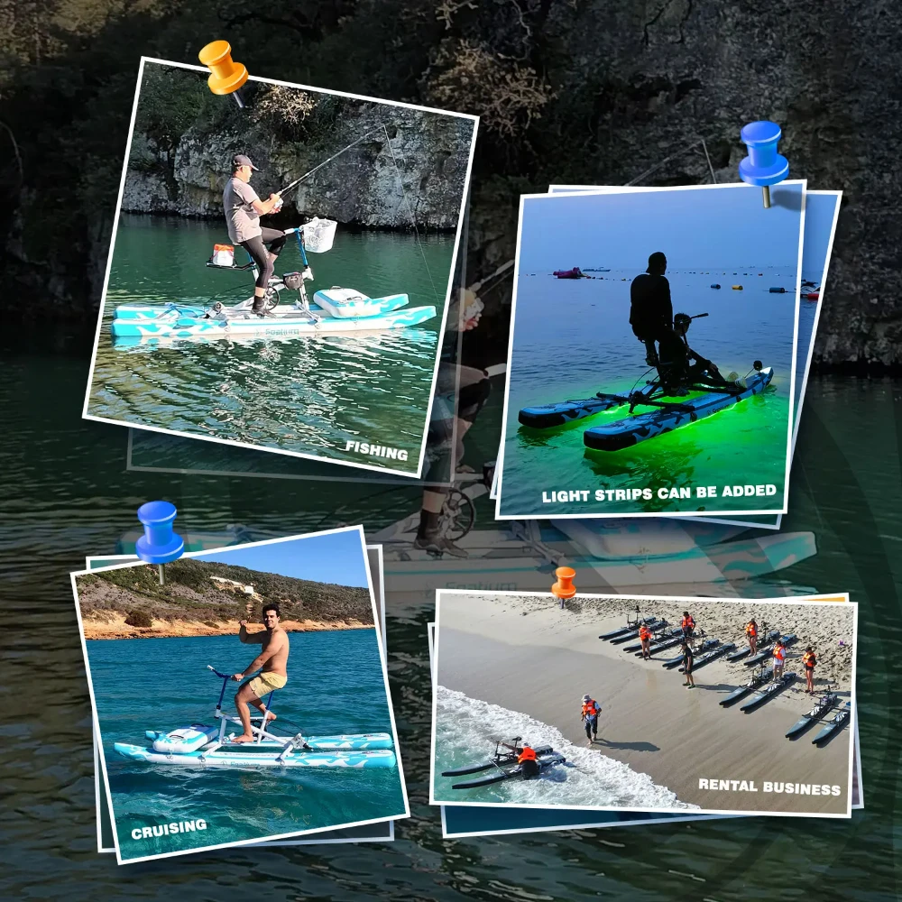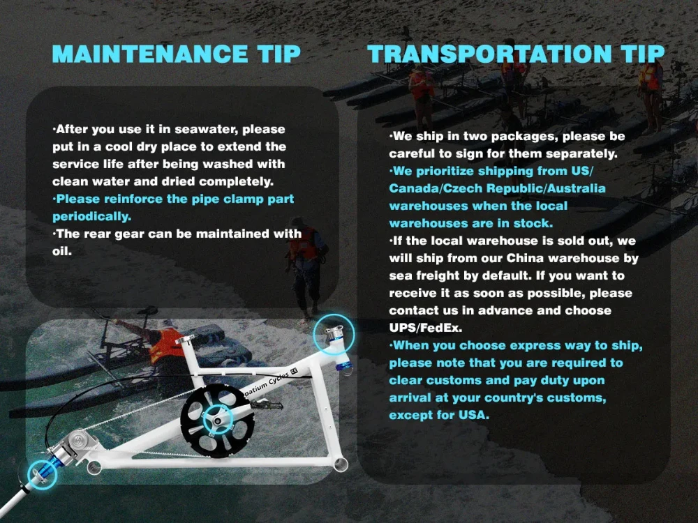 3. PLEASE TAKE CARE OF THE WATER BIKE WHEN IT IS RIDDEN AND AVOIDS PEDALING WITH EXCESSIVE FORCE. PLEASE PAYL ATTENTION NOT TO LET THE FLOATS CRASH WITH ANY SHARP OBJECT IN ORDER TO PREVENT AIR LEAKAGE.