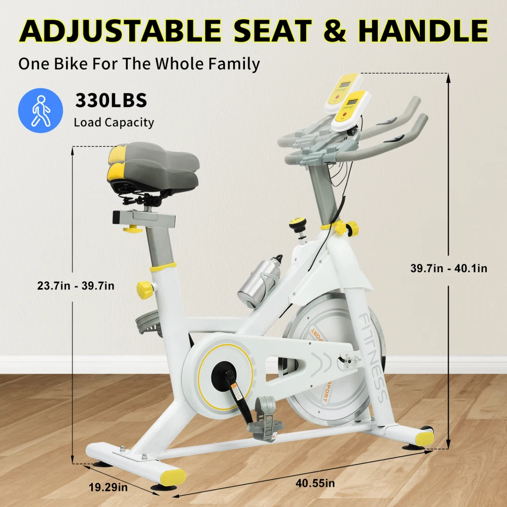 Quiet Cycling Bike Indoor Exercise Bike 5 Way Handlebar 7 Way Seat Yellow White Safety Stop IPAD Stand For All Levels Workout
