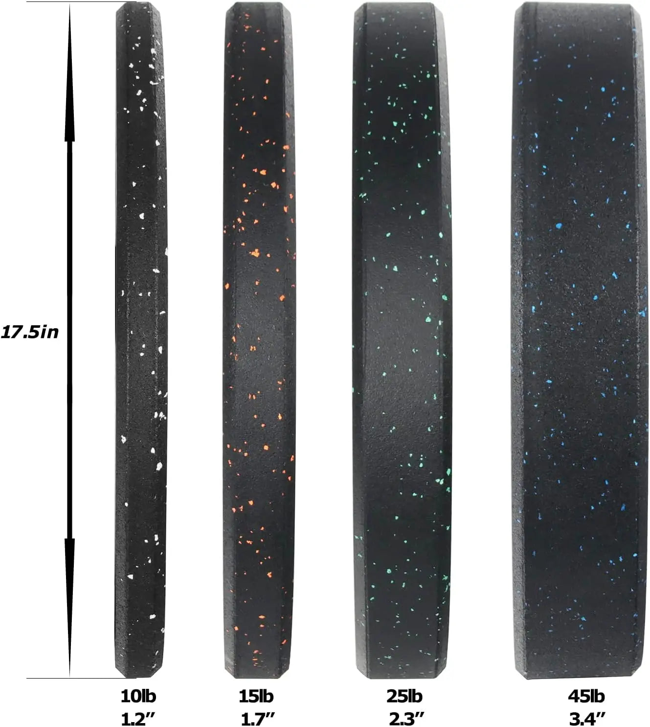 Package Includes: 2 X 10LB, 2 X 25LB, 2 X 45LB Olympic Bumper Plate. Low bounce for safety.
