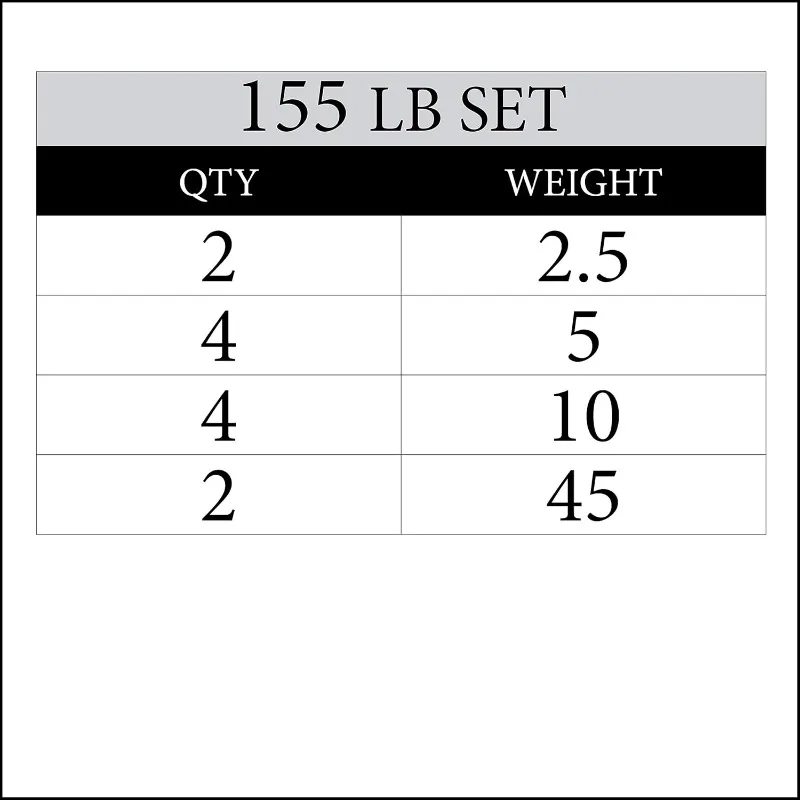 - OLYMPIC WEIGHTS: One 155 lb Set: (2) 2.5 lb, (4) 5 lb, (4) 10 lb and (2) 45 lb of TRI-GRIP Rubber Coated Weight Plates. Total Weight 155 lbs. Olympic barbell clamps NOT included.