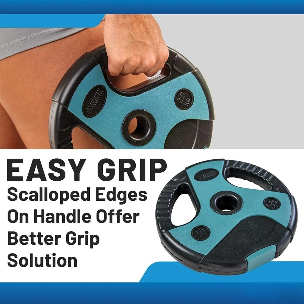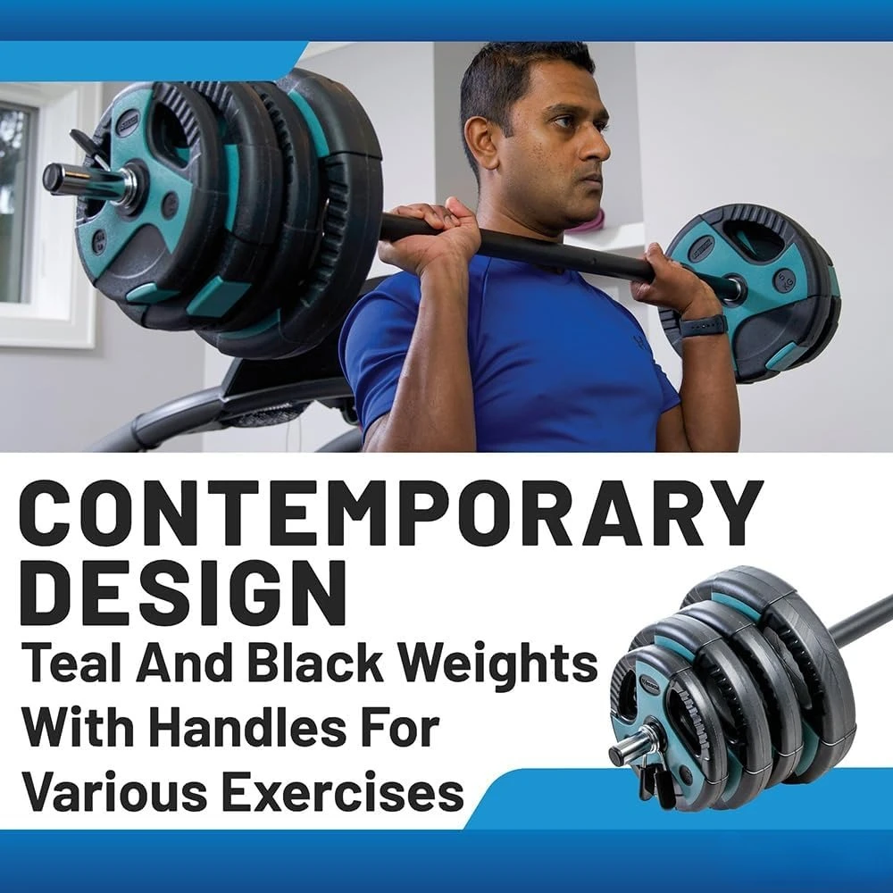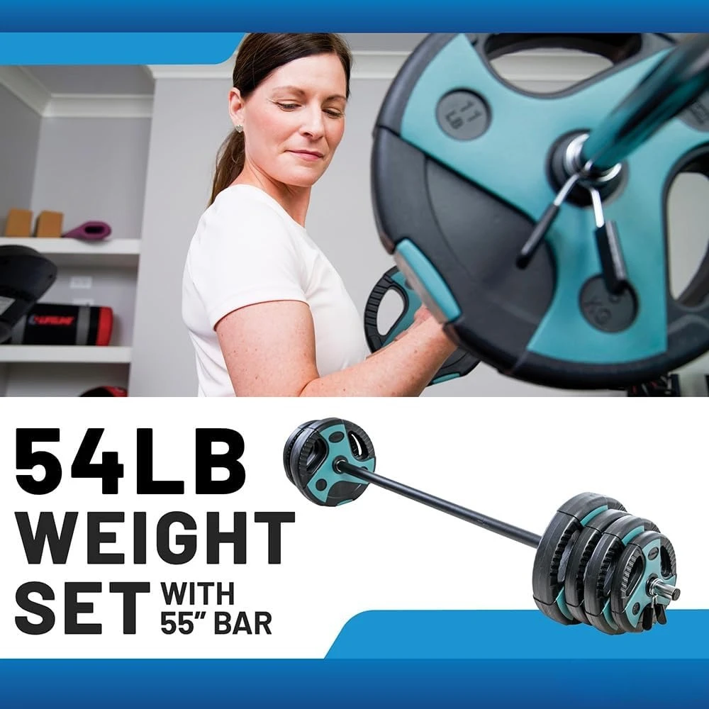 About this item 54 lb Barbell Weight Set includes: - 3 piece bar, Two (2) spring collars, Two (2) 11lb Weights, Four (4) 5.5lb Weights and Two (2) 2.75lb Weights. Adjust your weights for more options. Cushioned bar allows for comfort and versatility while lifting and squatting. The most comfortable bar you will find for a barbell-based workout. included spring clips allow for easy weight changes. The handled weight design allows for nearly unlimited exercise uses. Weights can now be used on or off the bar. Simply grip the handles and use them independent of the Barbell. Our high-quality, three-piece barbell is designed to be strong and space saving. Simply screw together to create a strong, durable barbell. Unscrew and store easily. Our barbell weight sets showcase a contemporary design, utilizing teal and black colored high-density plastic shells in combination with our premium three-piece barbell.