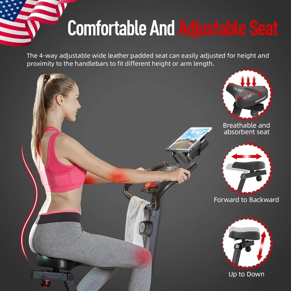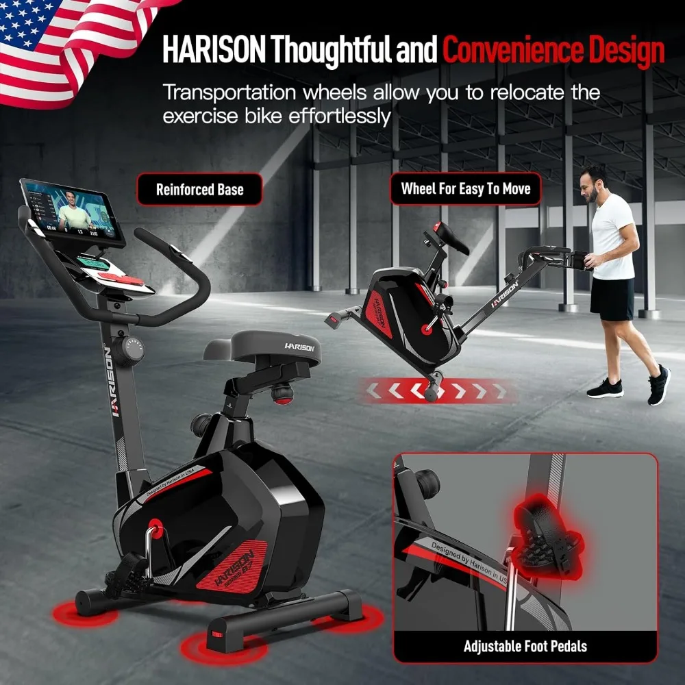 • 【MAGNETIC STATIONARY BIKE】 HARISON Upright exercise bike use Bi-directional magnetic flywheel provide you with quieter and smoother cycling than others, 14 levels of smooth magnetic resistance for a wide rang of workout intensity options, and US mute magnetic control system provide the user with a nearly silent workout, never disturb someone who is sleeping or watching TV.