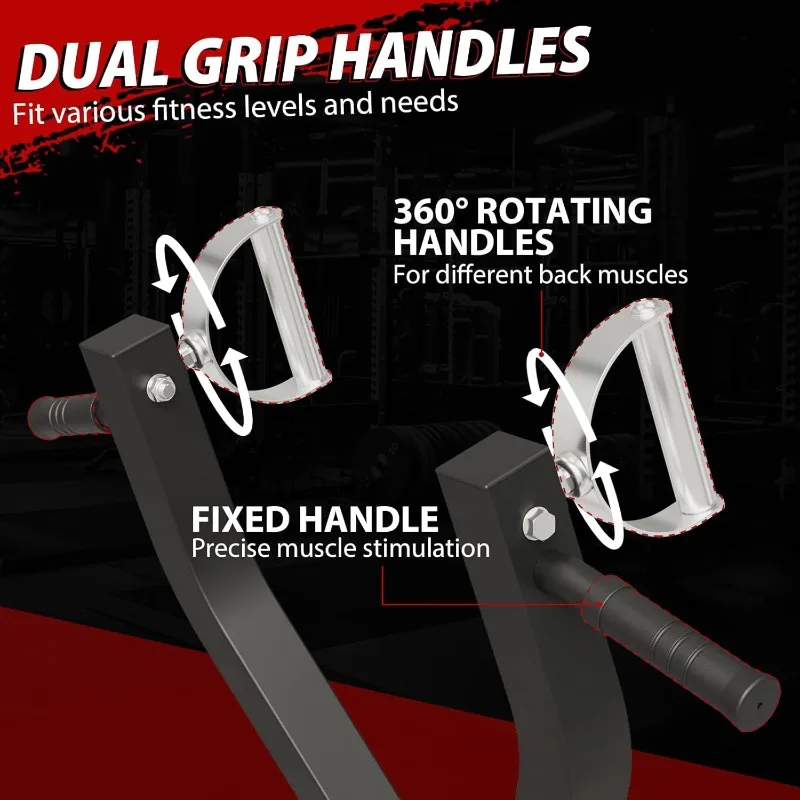 - [Dual Grip Handles]-This seated row machine plate loaded comes with two different types of grips. The fully rotating grip allows you to rotate your arms naturally for a comfortable motion while rowing, helping to prevent strain and injury. The fixed grip is for precise stimulation, similar to barbell and T-bar row machines. By simply adjusting the width of your grip and the width of your arms to target different muscle groups in your back, you can get the most out of your workout routine.